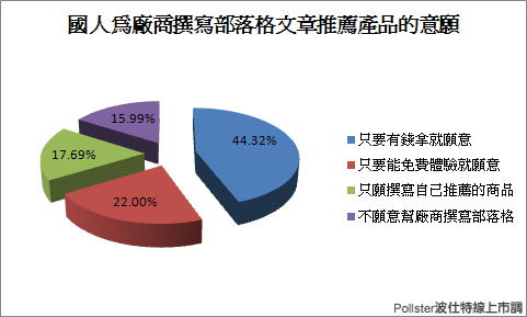 生意人腦筋也動得快,自然也想搭上部落格這波熱潮,傳達自家相關的商品與廣告,不過,究竟有多少部落客願意與之合作呢?根據波仕特線上市調網(http://www.pollster.com.tw)所進行的網路民調顯示,有44.32%的受訪者表示「只要有錢拿就願意」,他們可幫商家撰寫相關產品的行銷文章,以個人經驗的導入,在部落格曝光,達到宣傳的目的。有的人倒不是為了賺錢而為之,22%的受訪者認為「只要能免費體驗就願意」,起碼自己有親身驗證一下,而不是口說無憑、天馬行空的介紹。更有17.69%的部落客表示,「只願撰寫自己推薦的商品」,經過自己的檢視和體驗,個人認同、過關了,才能在部落格裡推薦,總不能自砸部落格的招牌。有些部落客乾脆就選擇「不願意幫廠商撰寫部落格」,占15.99%,與其夾在企業合作與個人道德的內心交戰,還不如不涉及這個領域。