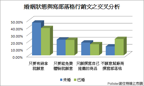 從不同婚姻狀況的數據分析,無論未婚和已婚,以選擇「只要有錢拿就願意」居首位,各占46.67%和38.89%。其次,「未婚」的受訪者「只要能免費體驗就願意」,占22.34%,位居第二;而「已婚」者則不同,以「不願意幫廠商撰寫部落格」,占23.33%,居次要。顯見不管結婚與否,多數人仍先考量到「生計」問題,將之視為工作的範圍,但在次要的數據比例上,「已婚」的社群又比「未婚」者,對於部落格涉入商業宣傳的手法,顯得較不認同、敬而遠之。
