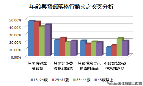 那麼,不同年齡層對此又有何想法呢?從數據來看,不管哪個年齡層,同樣仍以「只要有錢拿就願意」的比例最高(15~24歲:46.83%,25~34歲:45.64%,35~44歲:39.34%,41.90%)。但次要的選擇上,就有年齡層的區隔了。「15~24歲」和「25~34歲」的社群,選擇「只要能免費體驗就願意」居次位,各占21.43%和23.93%。「35~44歲」和「45歲以上」者,則以「不願意幫廠商撰寫部落格」占較高比例,各占23.36%和20.00%。其中「45歲以上」有同樣比例(20.00%)選擇「只要能免費體驗就願意」。35歲以上的社群對於幫廠商撰寫的意願低於35歲以下的年齡層,對於部落格的經營,仍舊期以個人自由發表、無任何明顯立場來發表自我己見。