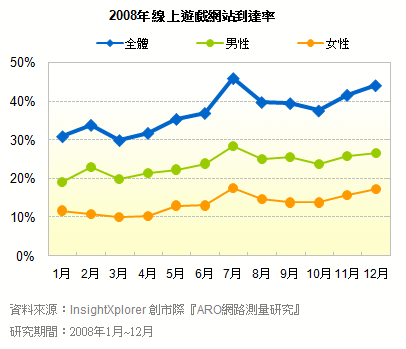 (Brain.com 2009-05-01)為了紓解平日累積的壓力,許多人在工作之餘會玩一些小遊戲怡情養性。不過,不景氣讓無薪假和失業人口大幅度增加,也讓更多潛在玩家加入遊戲產業的行列。要把遊戲玩得更上手,玩家們會選擇到各類遊戲網站找尋相關資訊,因此,創市際市場研究顧問公司針對「台灣地區男女網友在線上遊戲產業類別網站的使用概況」,做了觀察和研究。 隨著宅經濟的興起,線上遊戲產業蓬勃發展,資策會資訊市場情報中心(MIC)估計2008年線上遊戲市場規模超過100億,且每年將以6%~8%的幅度成長,後勢看好。在網路上,遊戲網站(註1)於2008年的變化又如何呢? 根據創市際ARO網路測量研究系統於2008年1月至12月統計,線上遊戲網站整年度的到達率呈現上揚趨勢;且無論男性或女性的網友,到達率都逐月提升(見下圖),顯示線上遊戲不只對男性有吸引力,女性的到達率也越來越高。