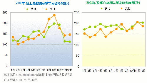 進一步觀察網友去年在線上遊戲網站的停留時間,發現女性網友在2008年1月、7~9月、11~12月的單次停留時間,都大於男性網友(見下圖)。另外,觀察不同性別使用遊戲內容網站(註2)的狀況,女性網友也在下半年的單次停留時間,逐漸出現剪刀交叉情形(見下圖)。 ![]() 根據ARO觀察發現,在2008年無論是線上遊戲網站或是遊戲內容網站,女性網友造訪或停留時間都呈現成長趨勢,顯示女性網友對於線上遊戲的關注度越來越高,值得網路遊戲業者進一步耕耘,2009年網路遊戲產業的發展令人期待! 註1:ARO遊戲網站是指個別線上遊戲的官方網站,提供遊戲訊息、會員註冊、遊戲下載等服務。 註2:ARO遊戲內容網站是此指線上遊戲入口網站或提供遊戲相關資訊的網站,提供網友最新遊戲資訊、評論或交換意見的園地,如巴哈姆特、遊戲基地。 |