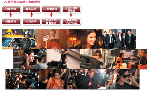 首先,要改變電視對消費者的意義。以前消費者是回家習慣性打開電視,現在LG要把電視打造成魅力商品,讓電視「主動」吸引消費者觀賞。主打策略是要讓LG從科技品牌變成娛樂品牌,使消費者從強調電視畫質,轉為對生活品質的訴求,讓電視不再只是電視。